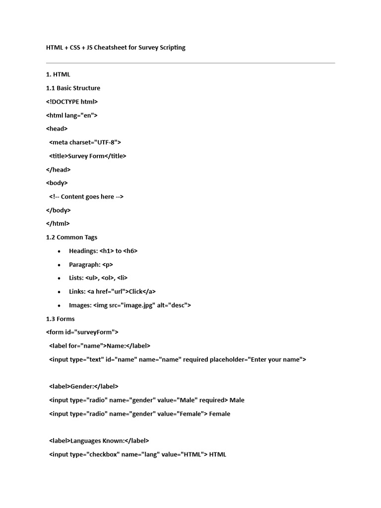 HTML, CSS, JS Cheatsheet For Survey Scripting | PDF | Html | Hypertext