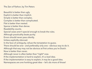 The Zen of Python, by Tim Peters Beautiful is better than ugly ...