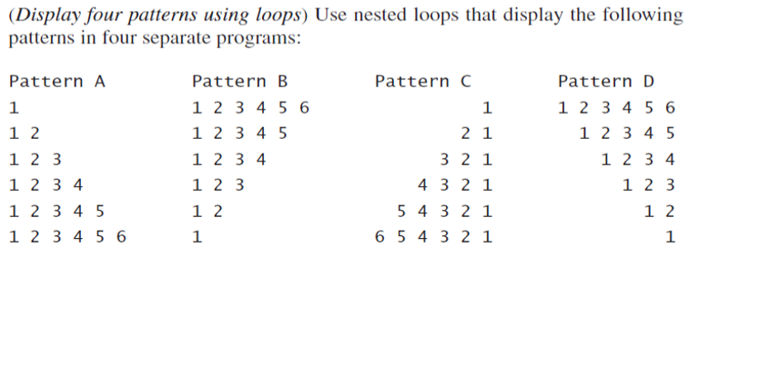 Solved (Display four patterns using loops) Use nested loops | Chegg.com