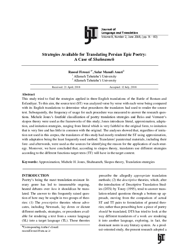 (PDF) Strategies Available for Translating Persian Epic Poetry: A Case ...