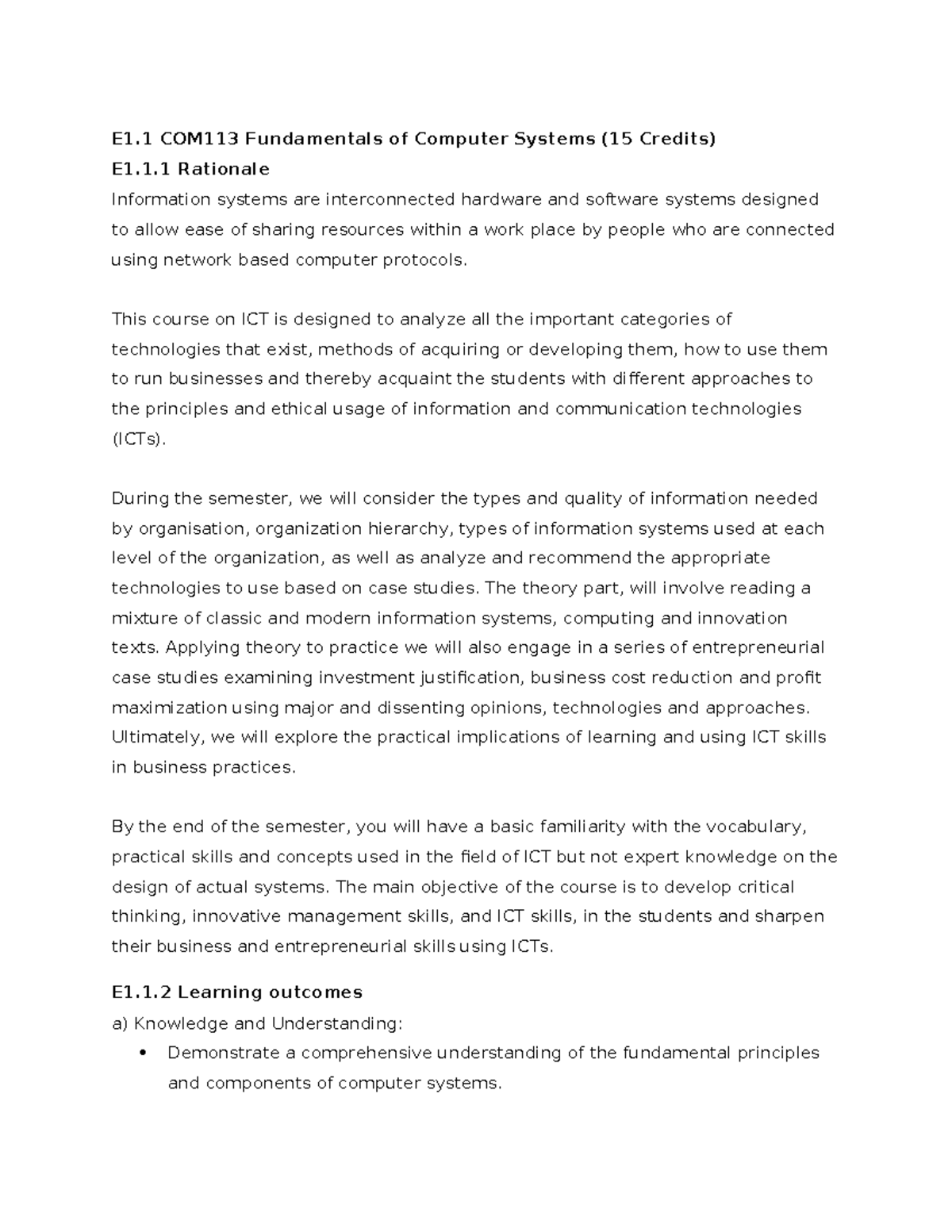 COM113 Fundamentals of Computer Systems: Course Overview and Learning ...