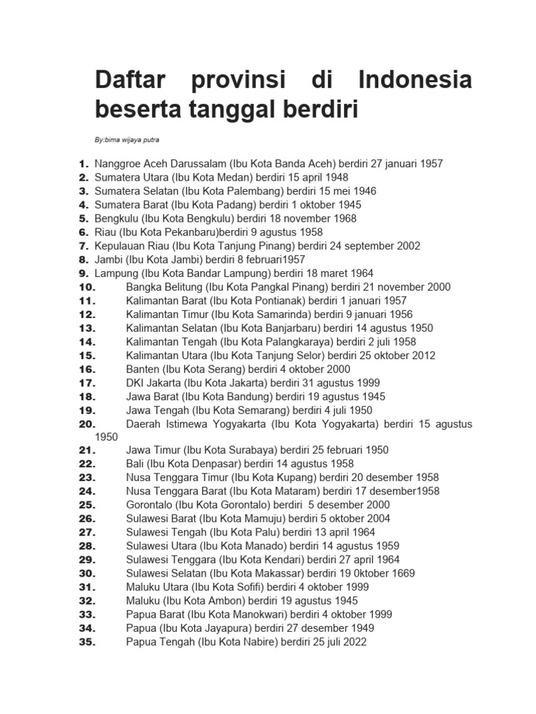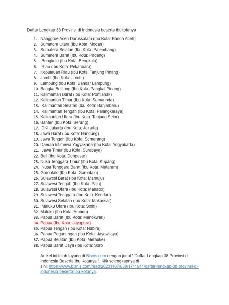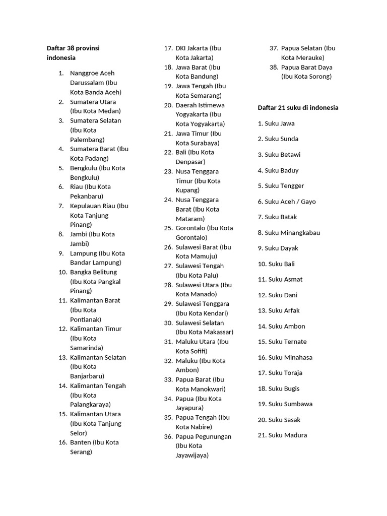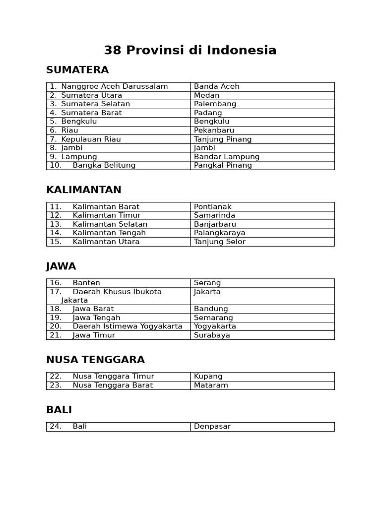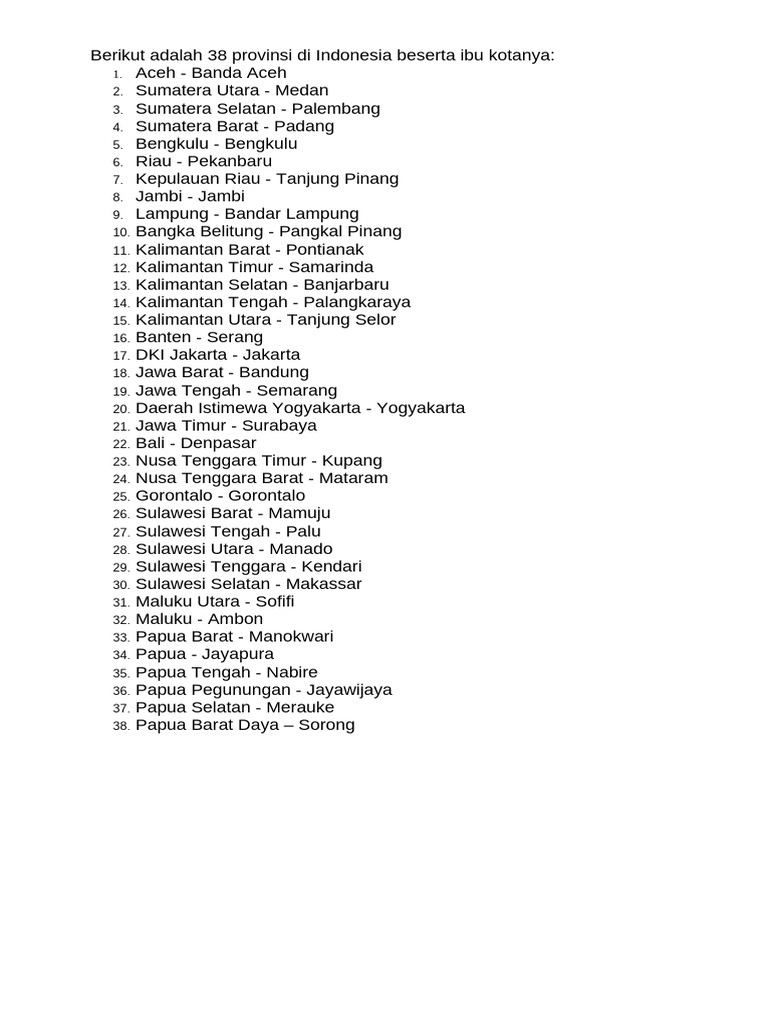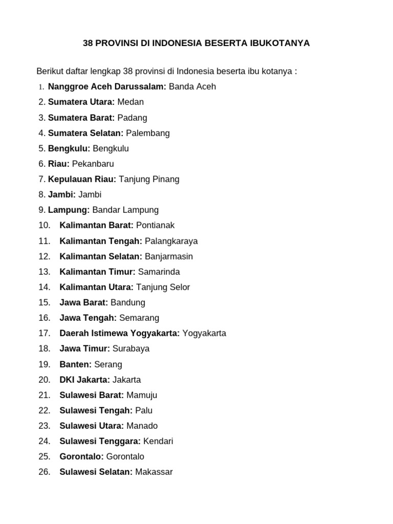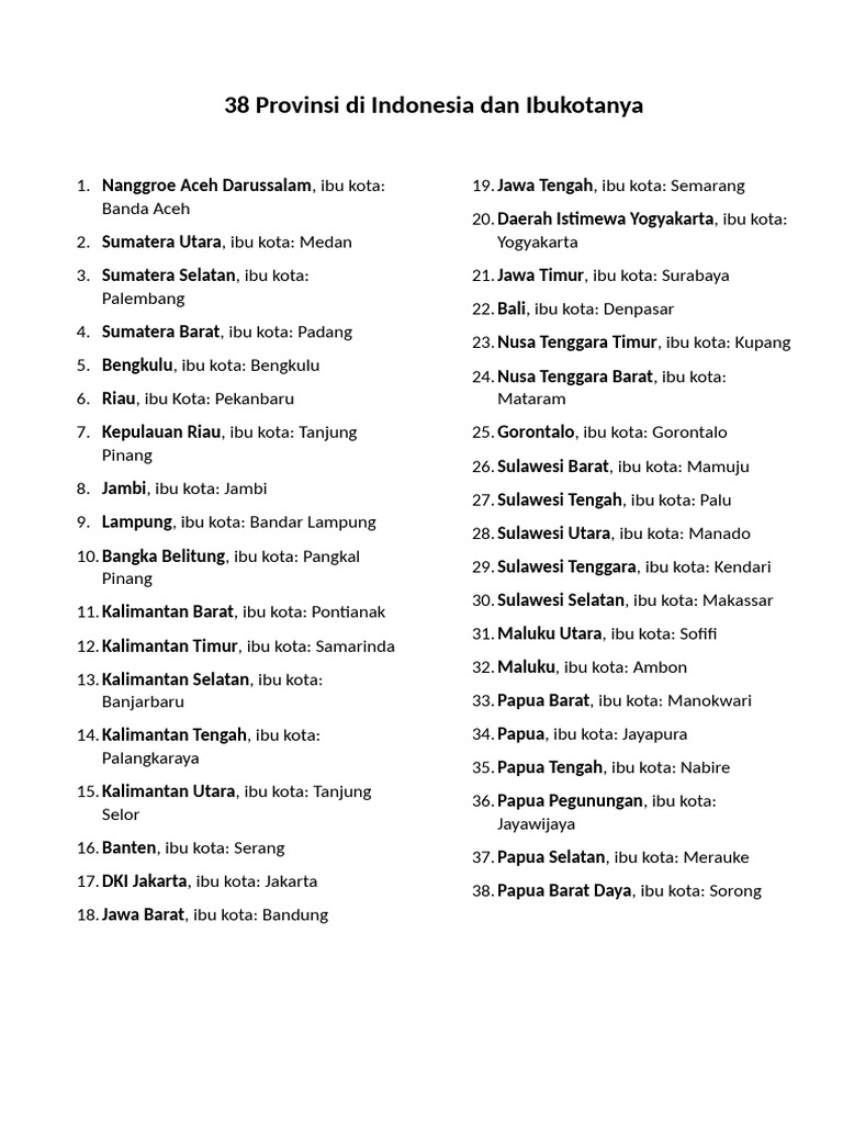 Daftar Lengkap 38 Provinsi Di Indonesia Beserta Ibu Kotanya | PDF