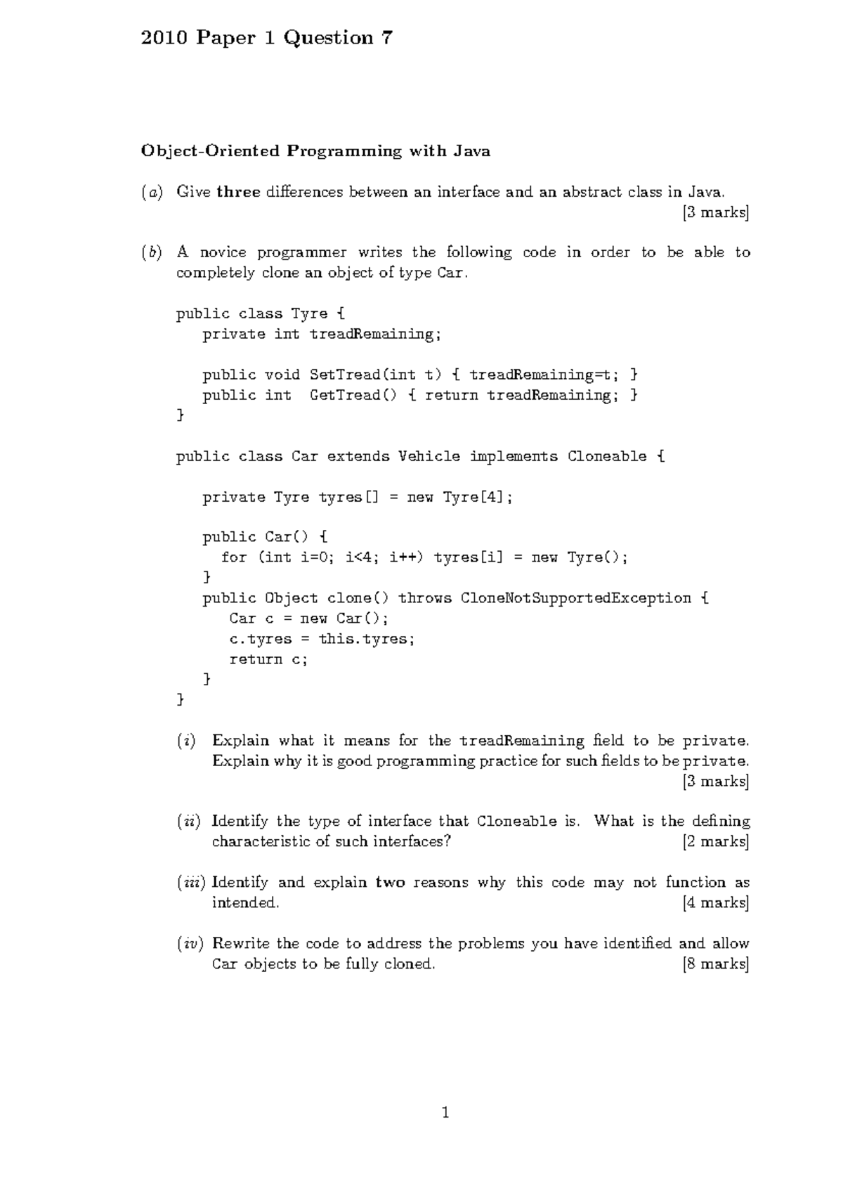 Y2010 P1Q7 - Java Interface vs Abstract Class & Cloning Issues - Studocu