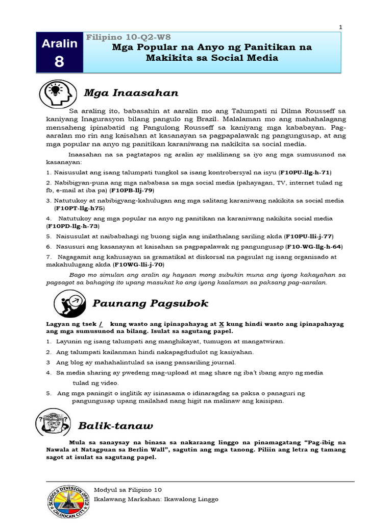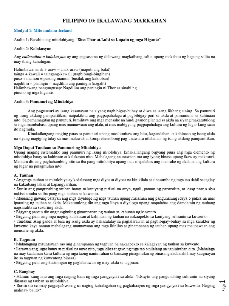 Filipino 10 Quarter 2 Module 1 | PDF