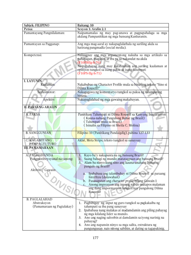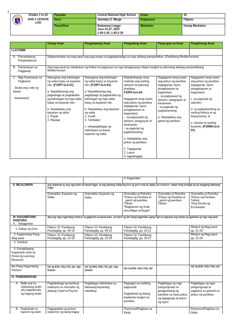 Filipino 10 - daily lesson log - GRADE 1 to 12 DAILY LESSON LOG (Pang ...