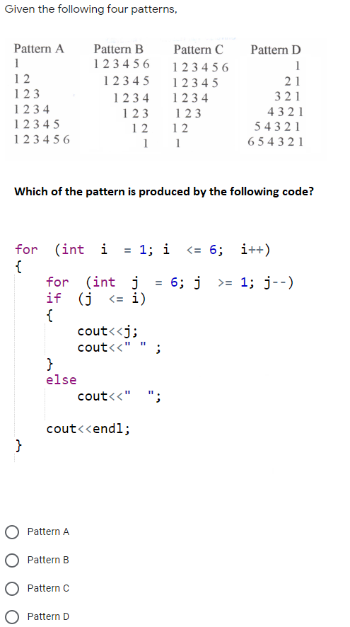 Solved Given the following four patterns, Pattern A 1 12 123 | Chegg.com