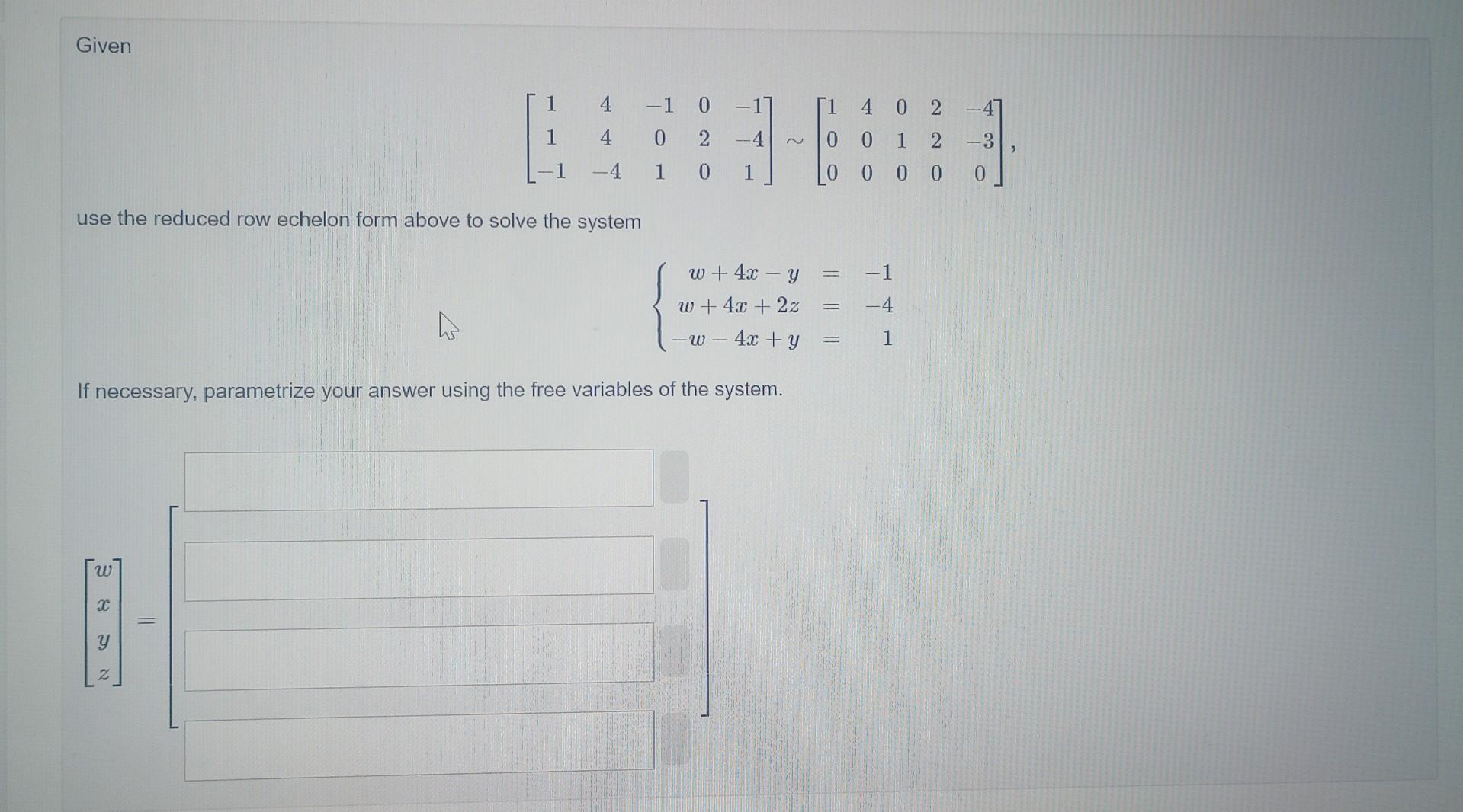 Solved Given ⎣⎡11−144−4−101020−1−41⎦⎤∼⎣⎡100400010220−4−30⎦⎤ | Chegg.com