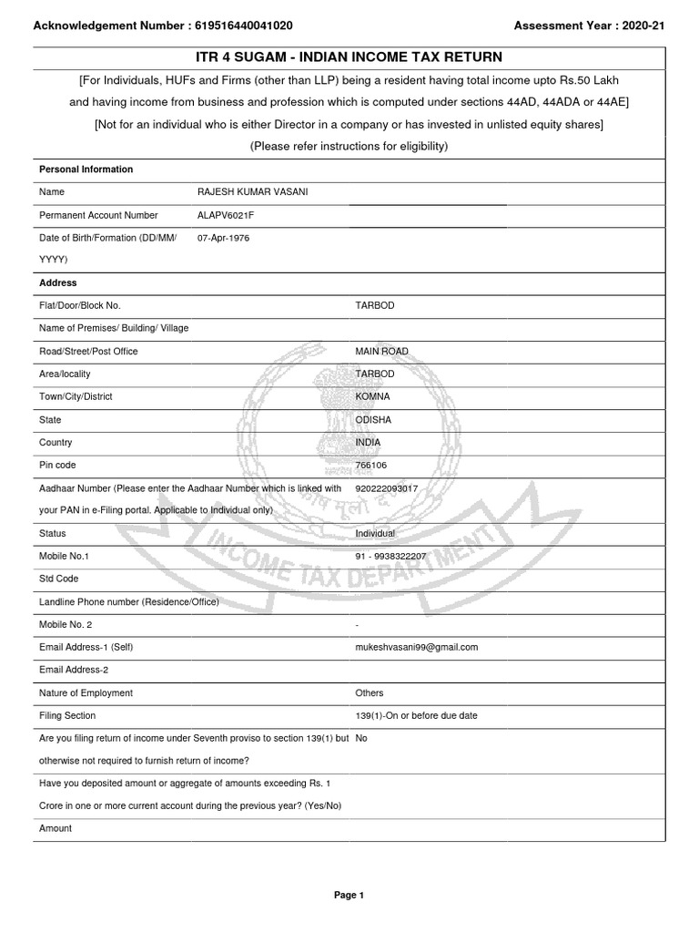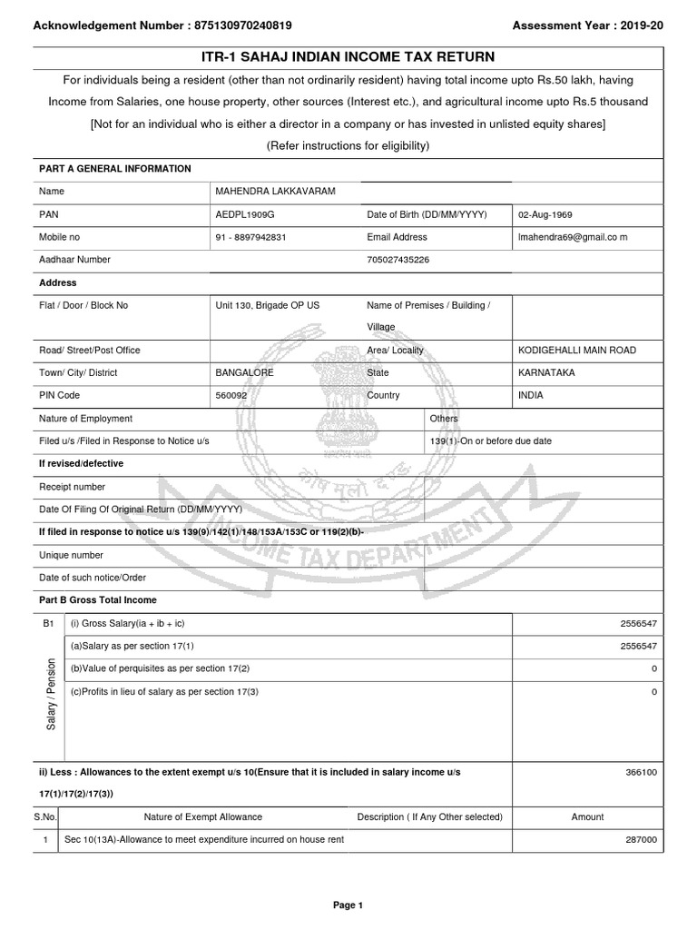 ITR-1 Sahaj Income Tax Return 2020-21 | PDF | Tax Deduction | Pension