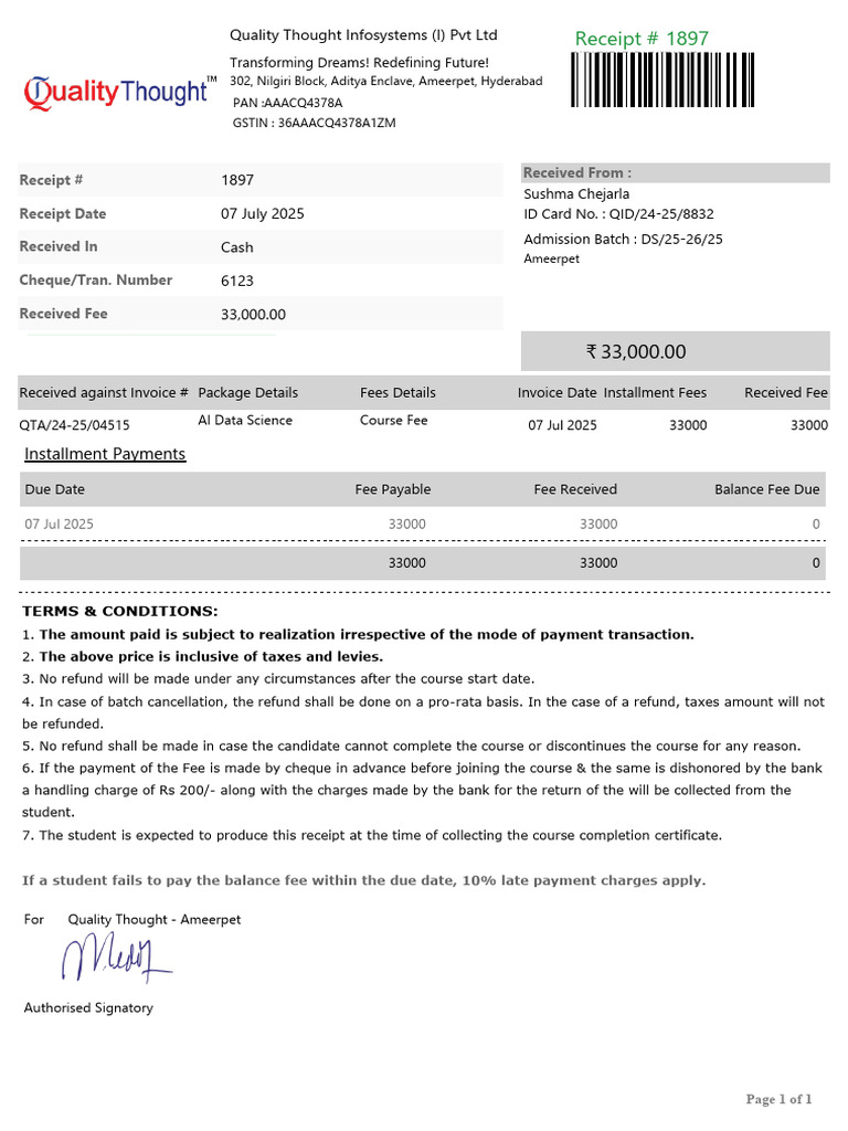 Receipt # 1897: Quality Thought Infosystems (I) PVT LTD | PDF | Receipt ...
