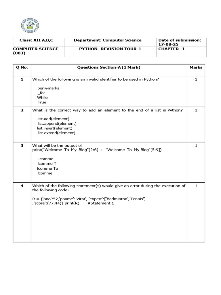 STD XII C.S(python revision Tour-I) - CLASS XII - WORKSHEET 2024- 25 ...