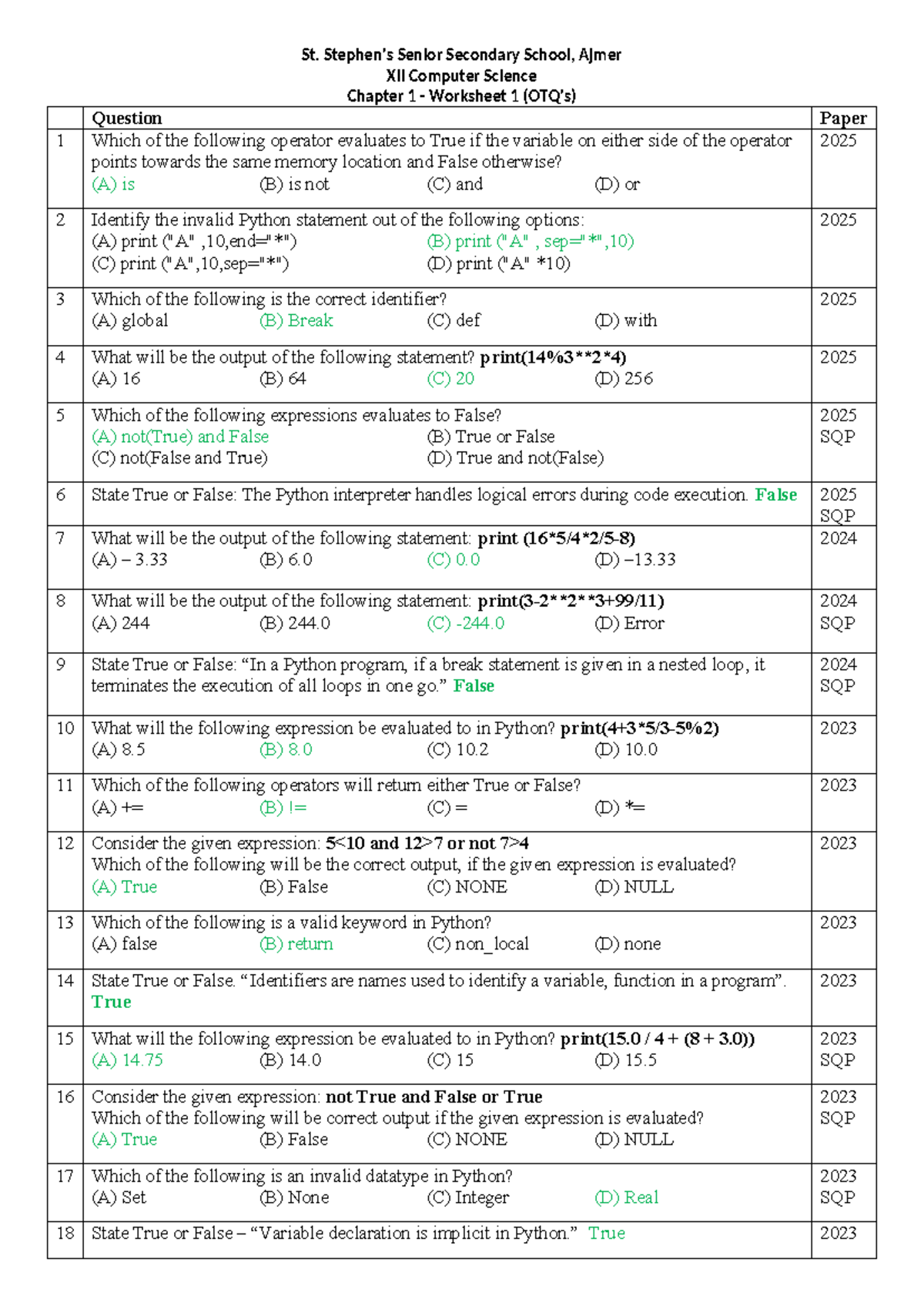 12 CS PYQ - 1 Python Revision Tour I Worksheet Solutions - Studocu