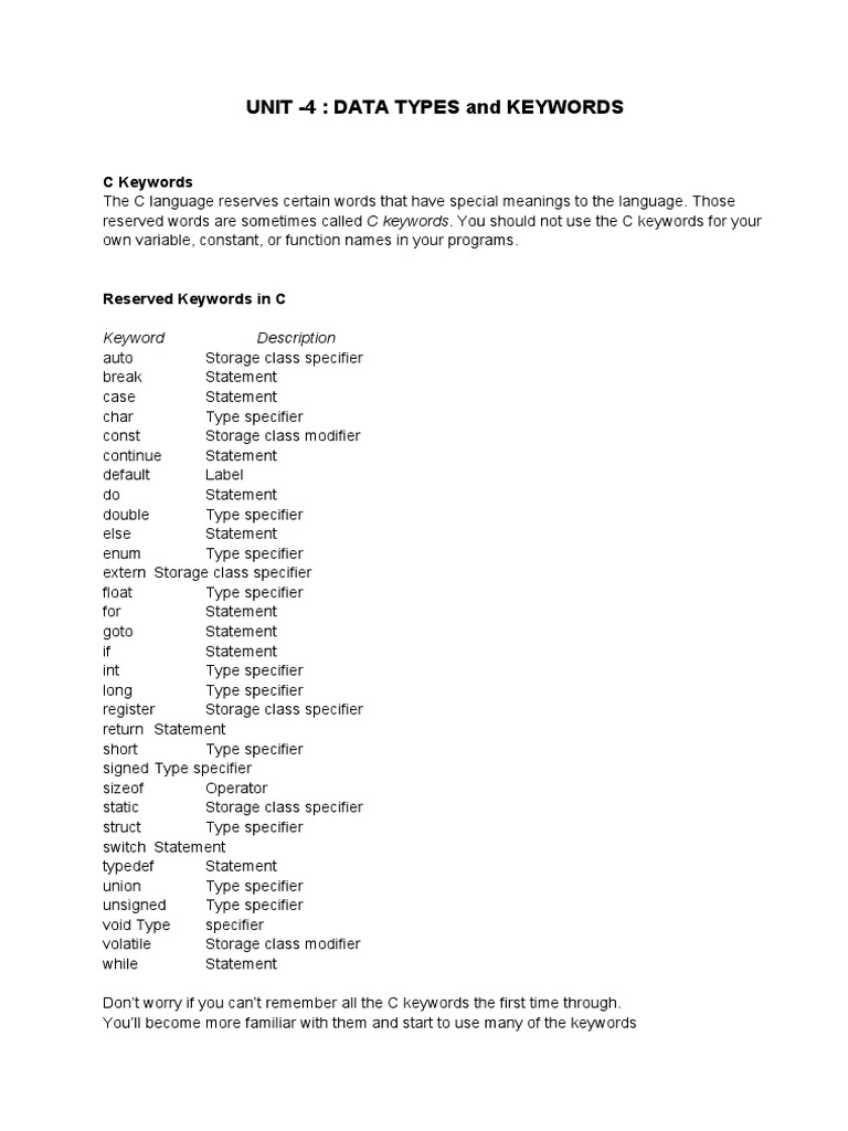 C Keywords and Data Types Overview | PDF | Integer (Computer Science ...