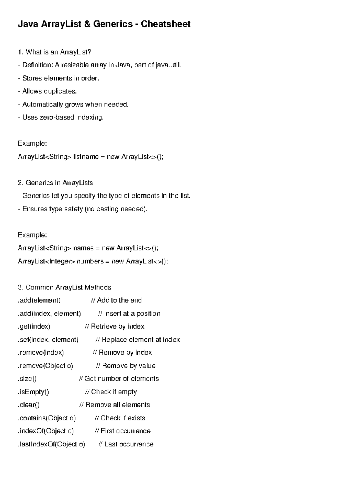 Java ArrayList Generics Cheatsheet: Key Concepts & Methods - Studocu