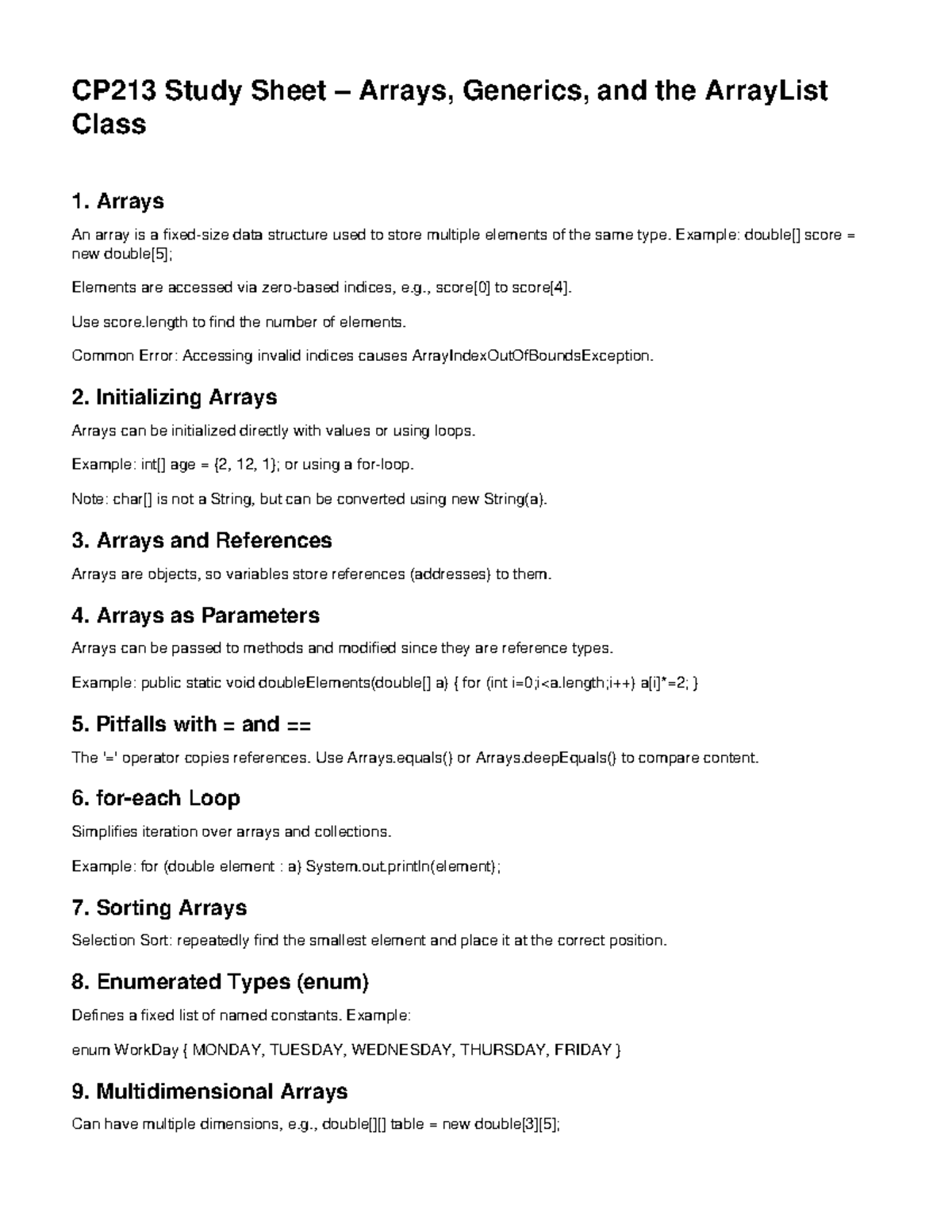 CP213 Study Sheet: Arrays, Generics, and ArrayList Class Overview - Studocu