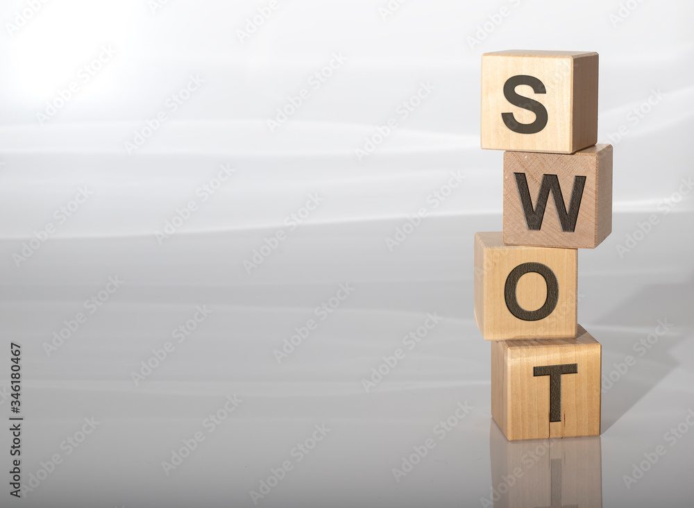 Four wooden cubes with text SWOT (meaning Strengths, Weaknesses ...