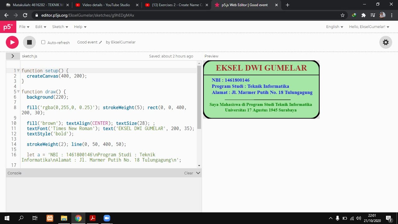 Create Name Card in p5.js - Exercises 2 | Eksel Dwi Gumelar ...