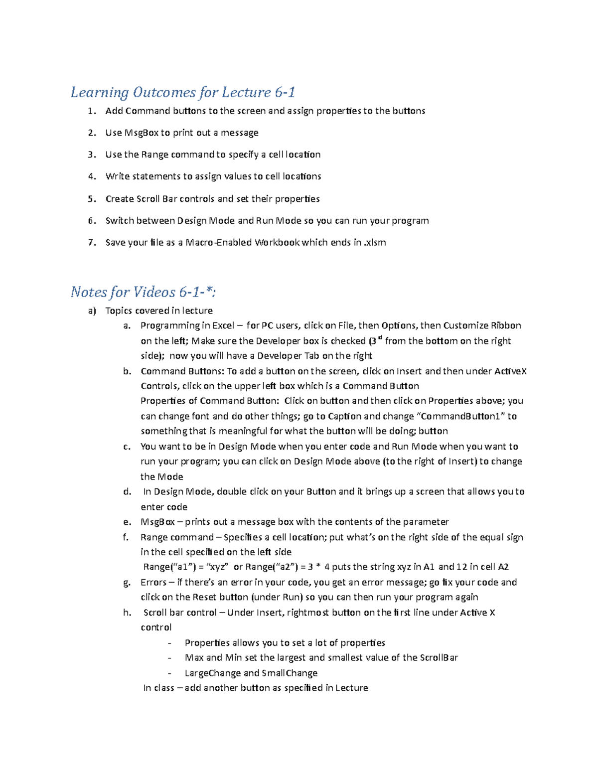 Notes 6-1 - Learning Outcomes for Lecture 6- Add Command buttons to the ...