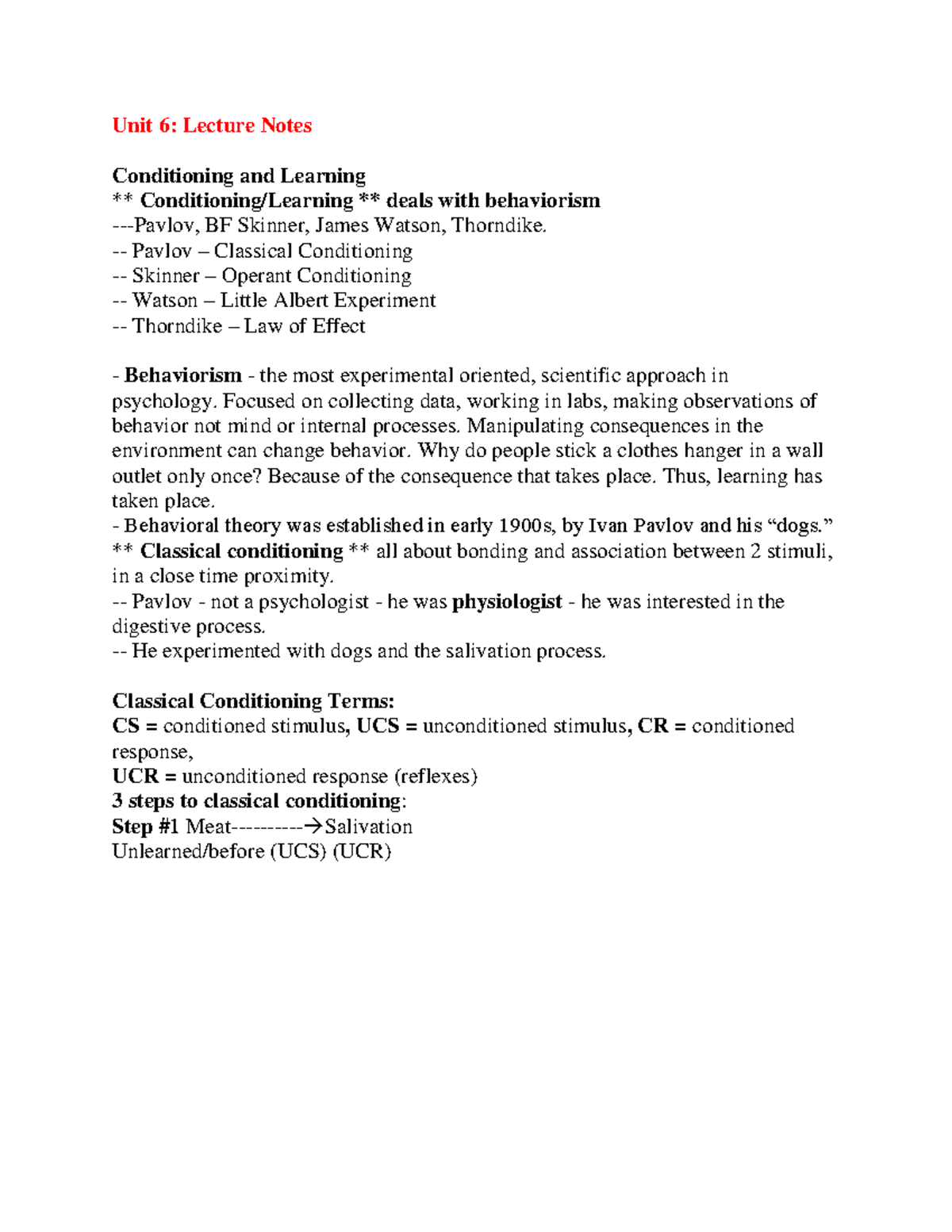 PSY Unit 6 Lecture Notes - Unit 6: Lecture Notes Conditioning and ...