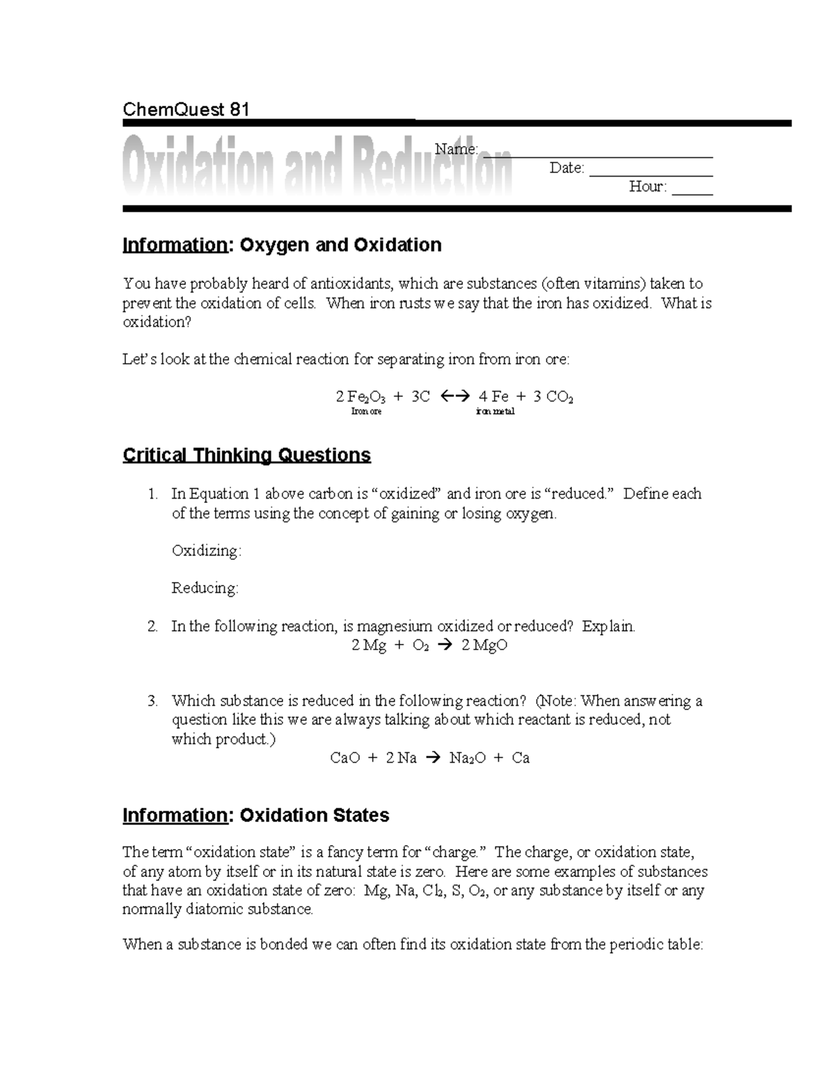 Chemquest 81 - ChemQuest 81 Name: ____________________________ Date ...