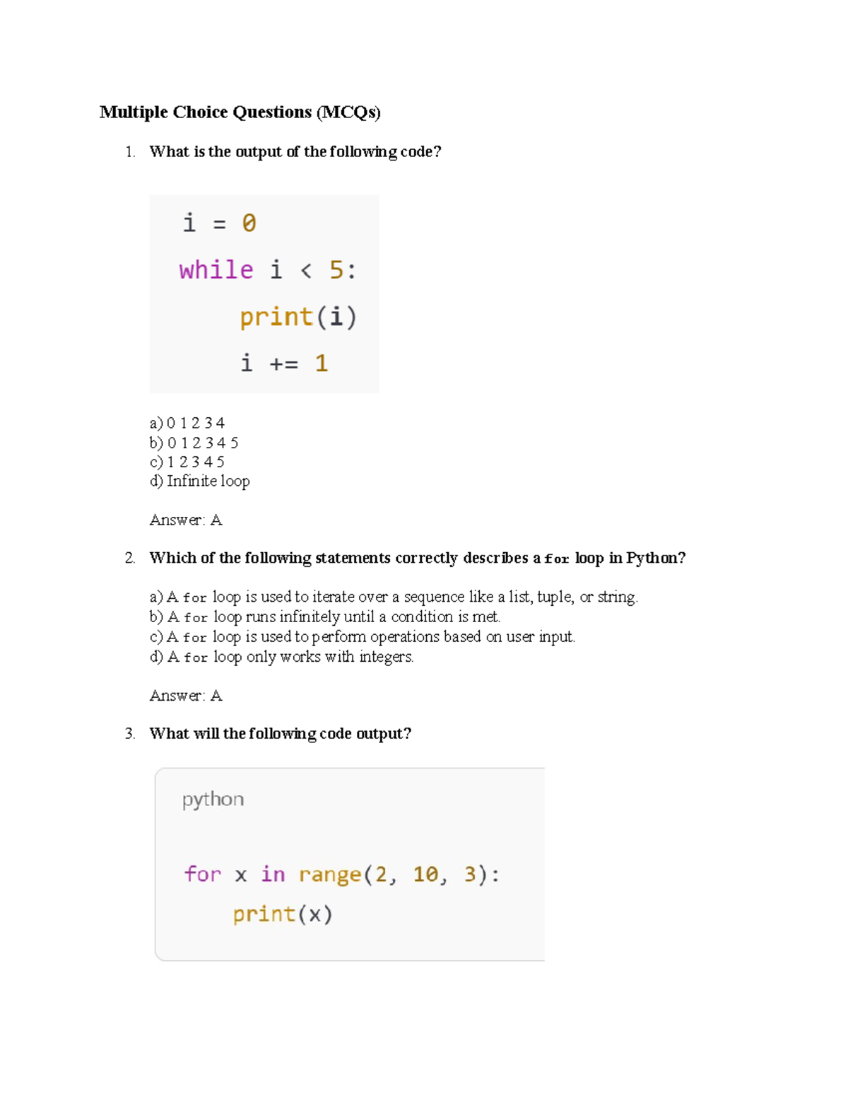 Python quiz Looping 1 - Multiple Choice Questions (MCQs) 1. What is the ...