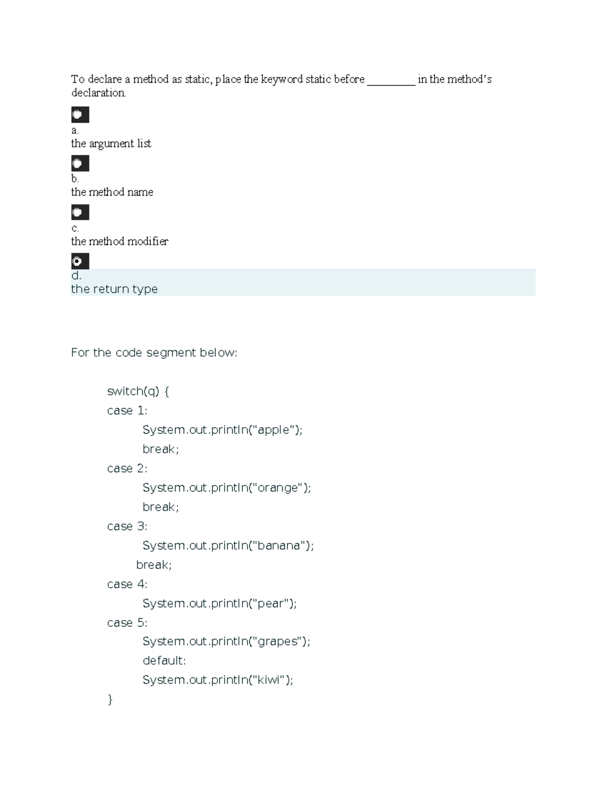 Java Programming 2nd Quiz - Methods, Control Flow, and Output - Studocu