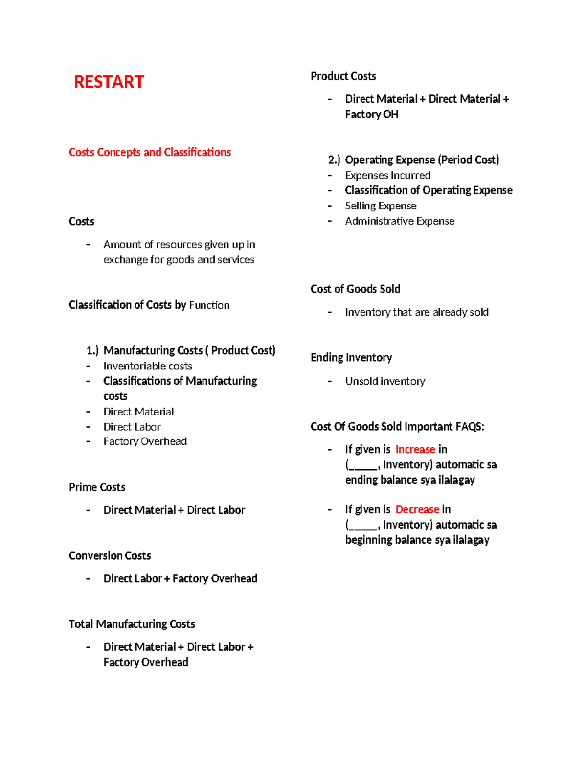 Cost Accounting Concepts & Classifications - RESTART Guide - Studocu