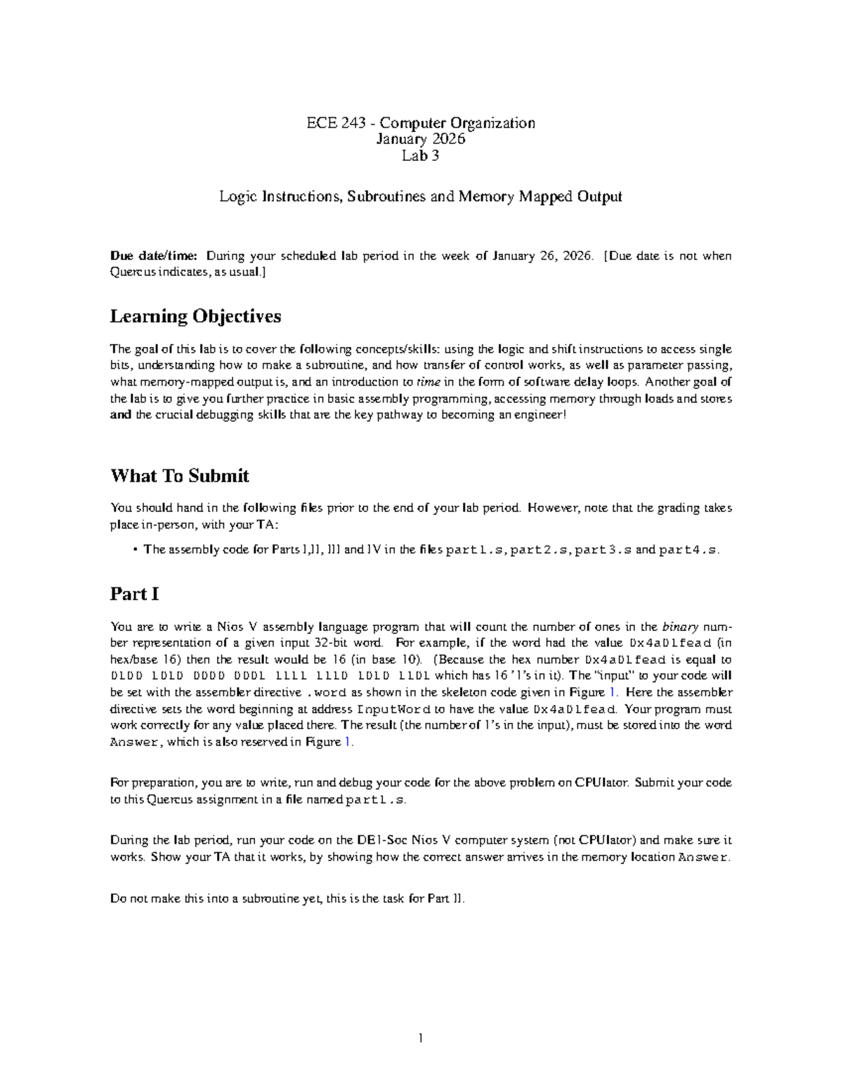 ECE 243 Lab 3: Logic Instructions, Subroutines & Memory Output - Studocu