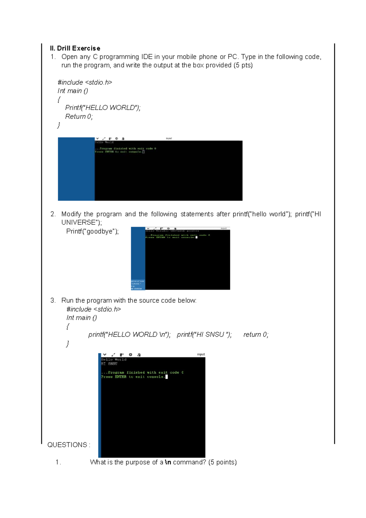 C Programming Notes: Drill Exercise 1 and Output Analysis - Studocu