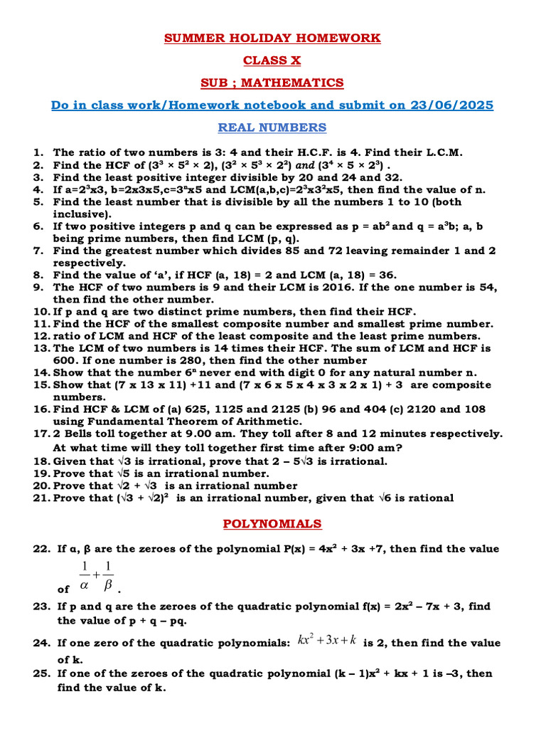 Summer Homework Class 10 2025-26 | PDF | Polynomial | Zero Of A Function