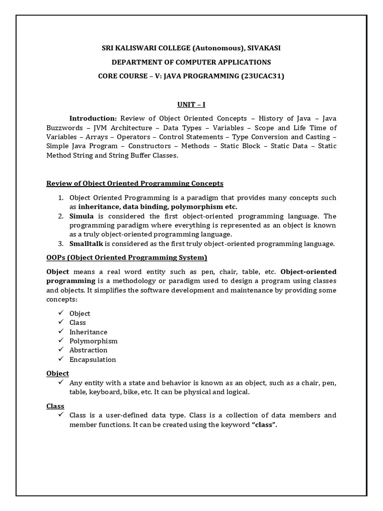 JAVA UNIT-I Notes: Object Oriented Programming Concepts in Java - Studocu