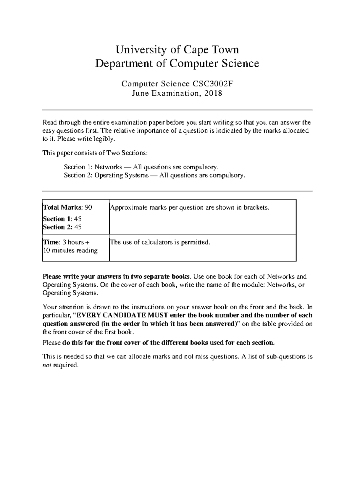 CSC3002F June 2018 Exam Paper - Computer Science Networks & OS - Studocu