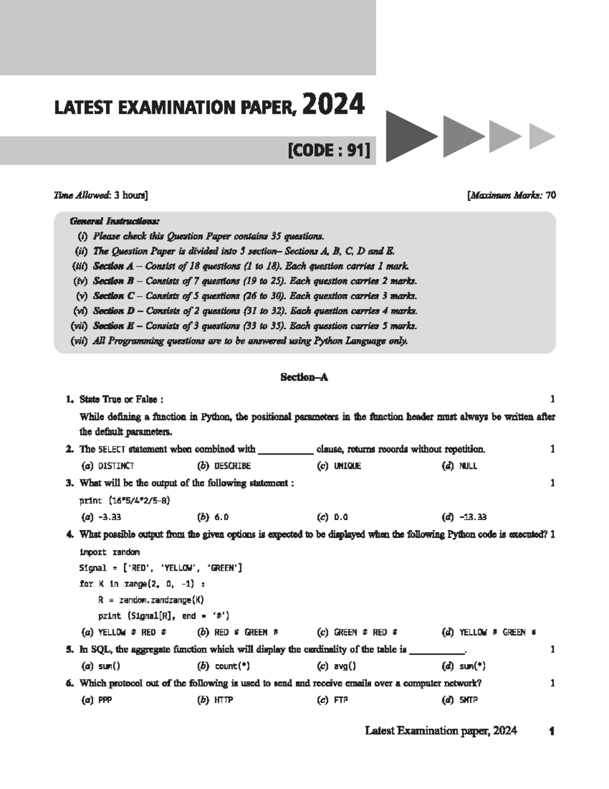 Final Exam Paper - Computer Science 2024: 70 Marks, 35 Questions - Studocu