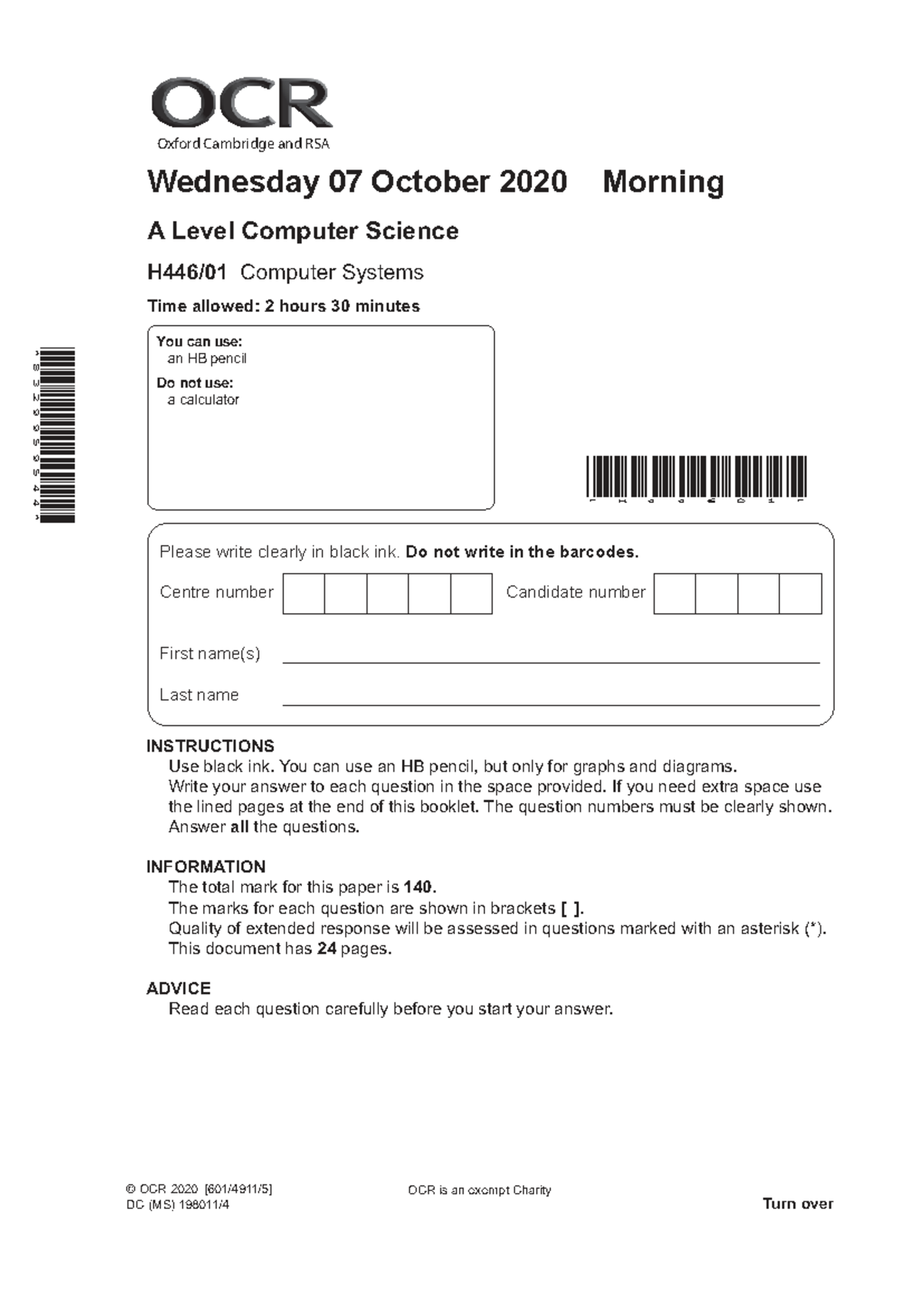 A Level Computer Science (H446/01) Exam Paper - Computer Systems, Oct ...
