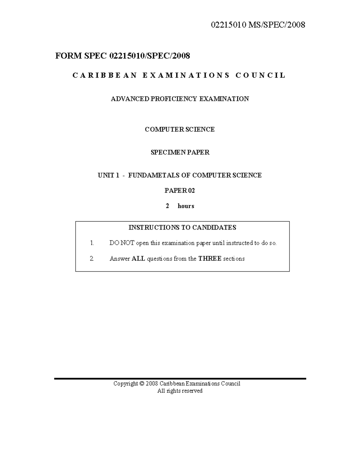 Computer Science 02215010 U1 P2 2008 Specimen Exam Paper - Studocu