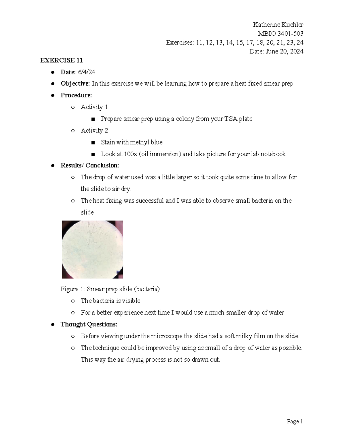 MBIO Lab Exercise 11.docx - Smear Preparation Objective: The main ...