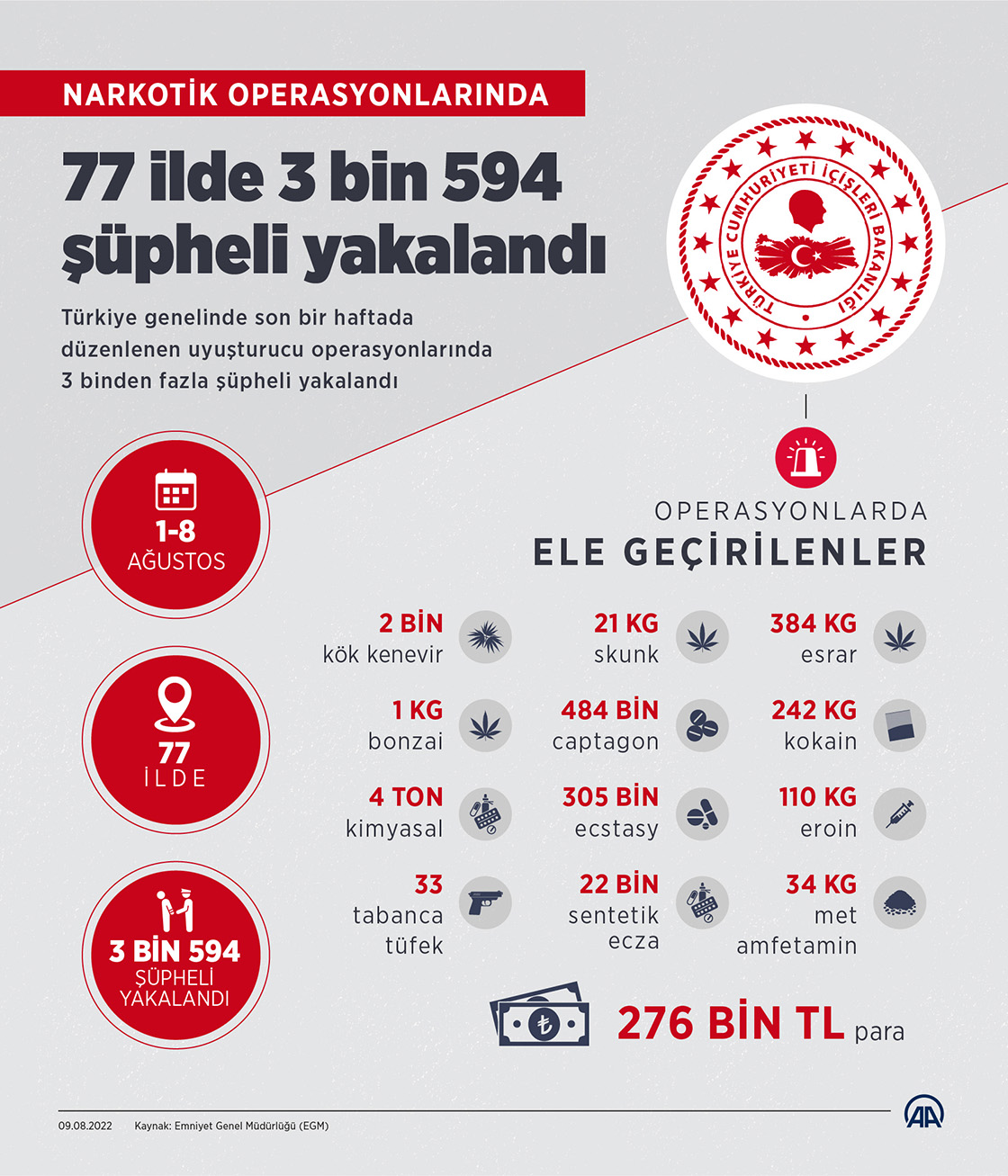 Narkotik operasyonlarında 77 ilde 3 bin 594 şüpheli yakalandı