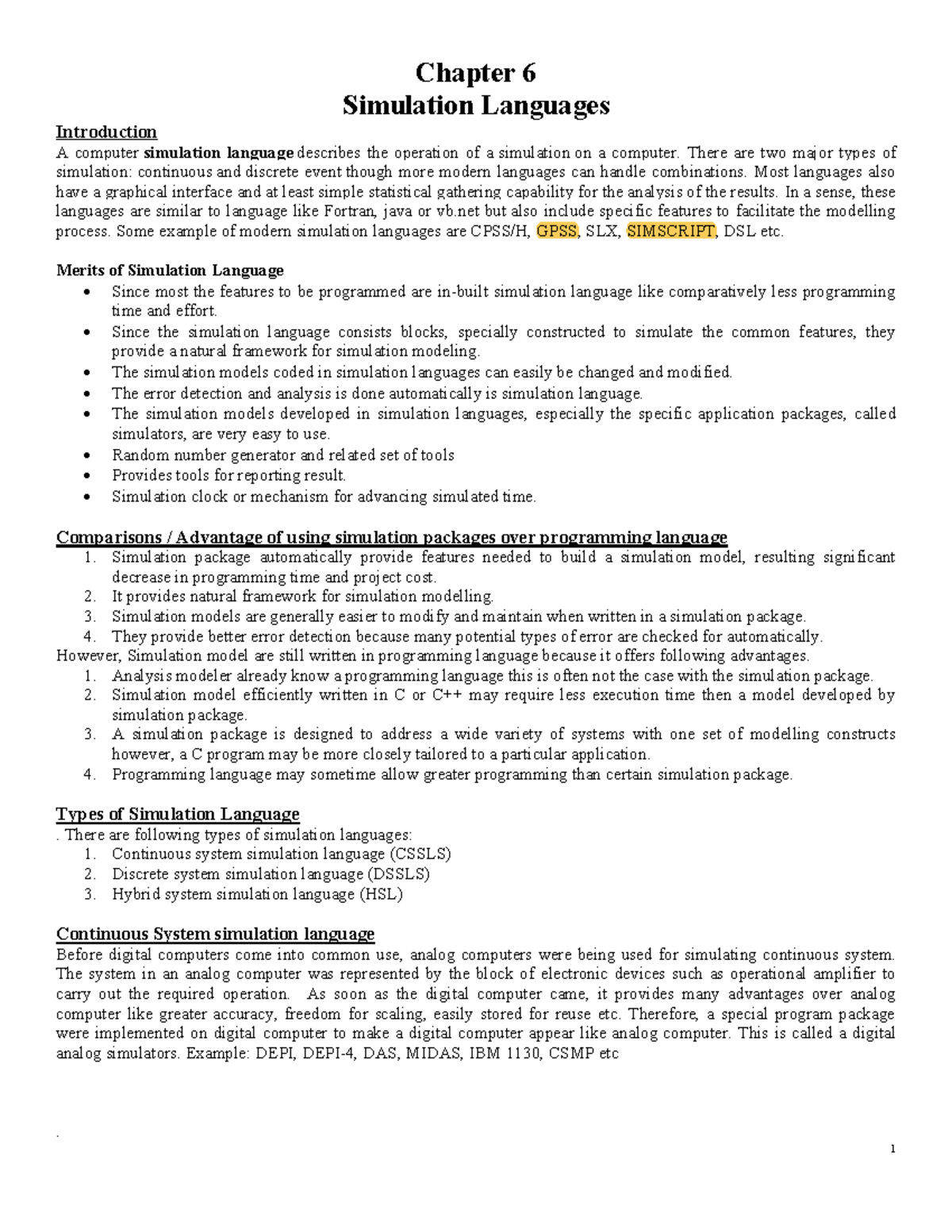 Chapter 6: Introduction to Simulation Languages and Their Types - Studocu