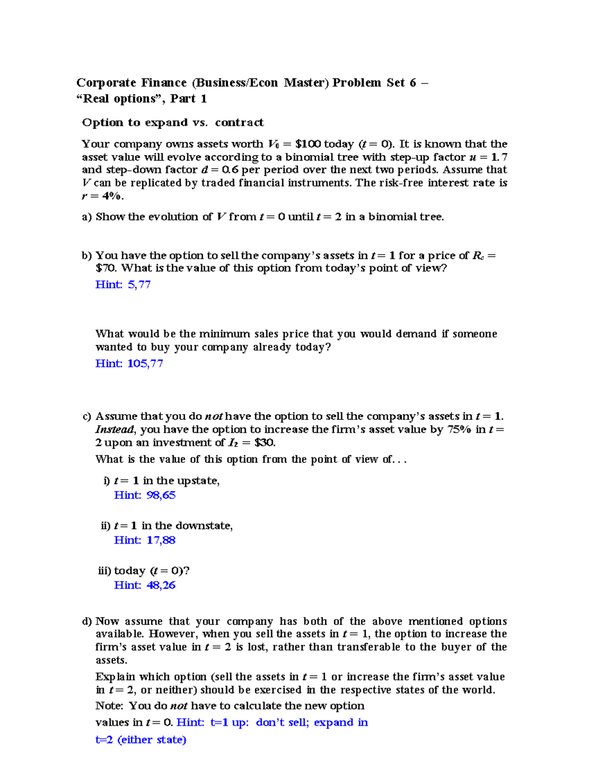 PS Real Options Part 1 Q Hints - Corporate Finance (Business/Econ ...