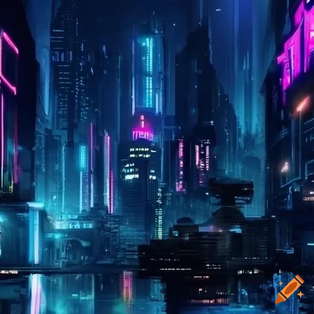 A neon-lit cyberpunk city at night with tall buildings, reflective ...