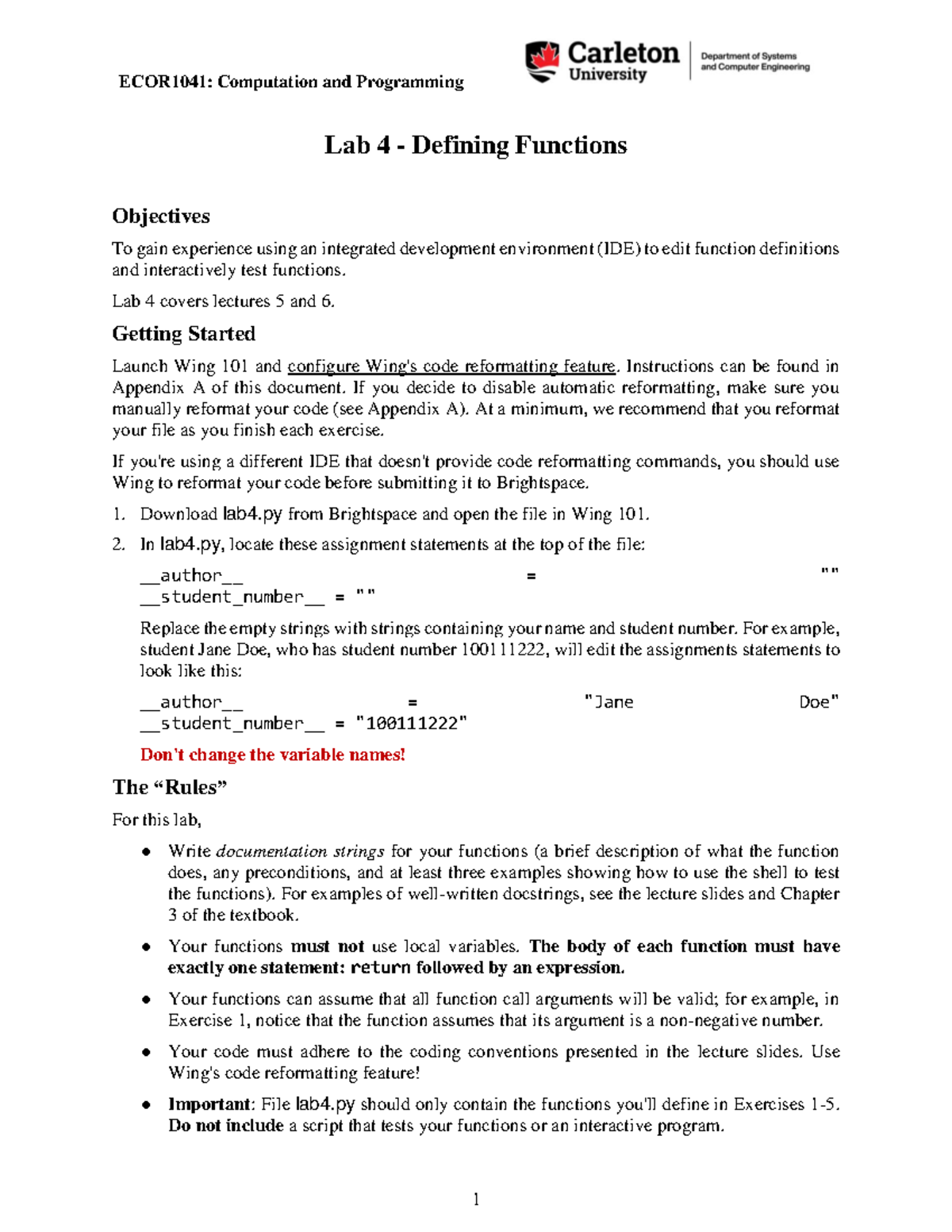 ECOR1041: Lab 4 - Function Definitions and Testing Instructions - Studocu