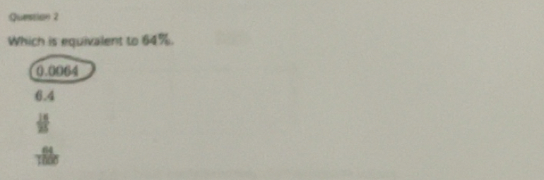 Solved: Quession 2 Which is equivalent to 64%. 0.0064 6.4 16/25 64/1000 ...