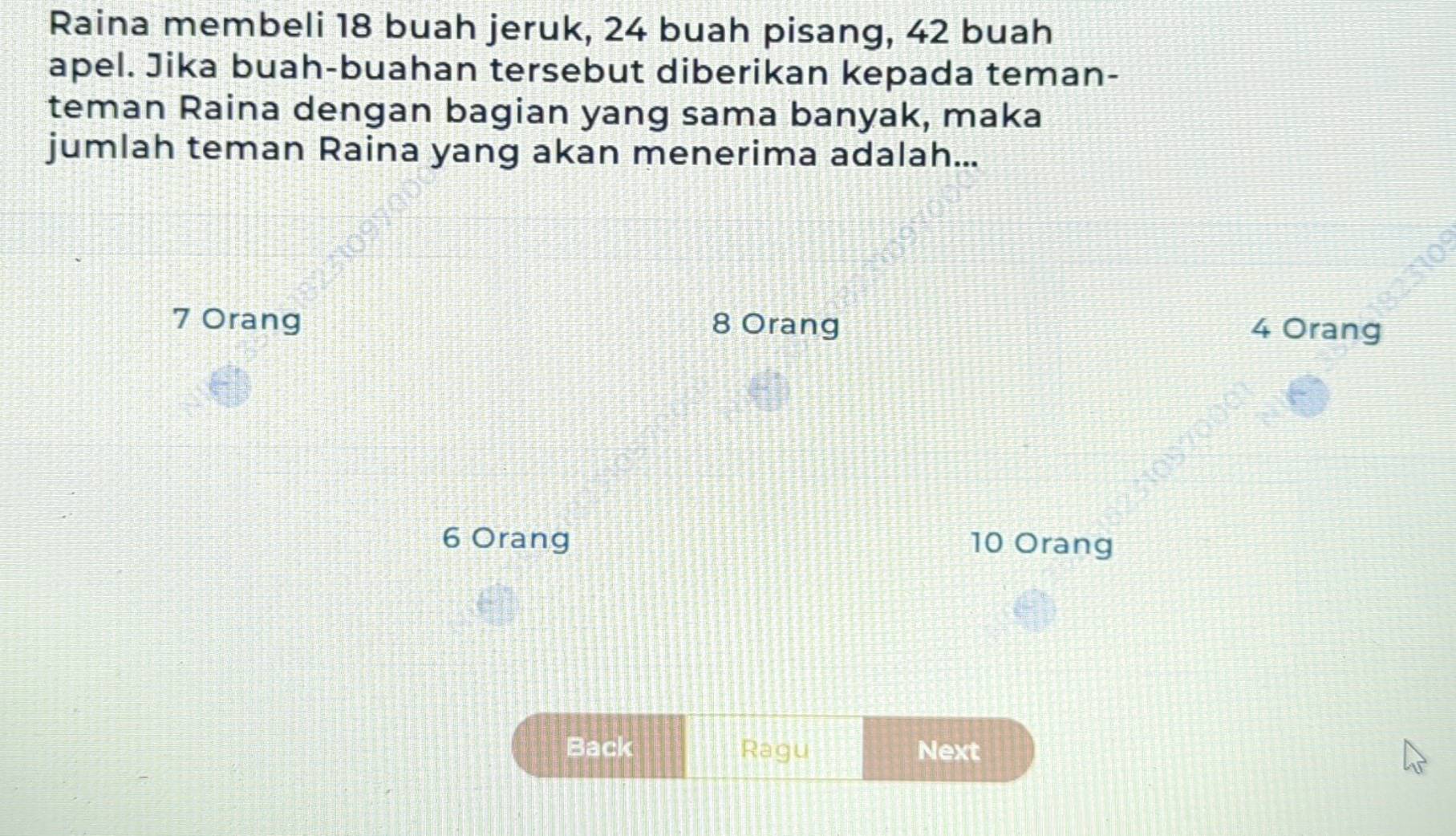 Telah dijawab:Raina membeli 18 buah jeruk, 24 buah pisang, 42 buah apel ...