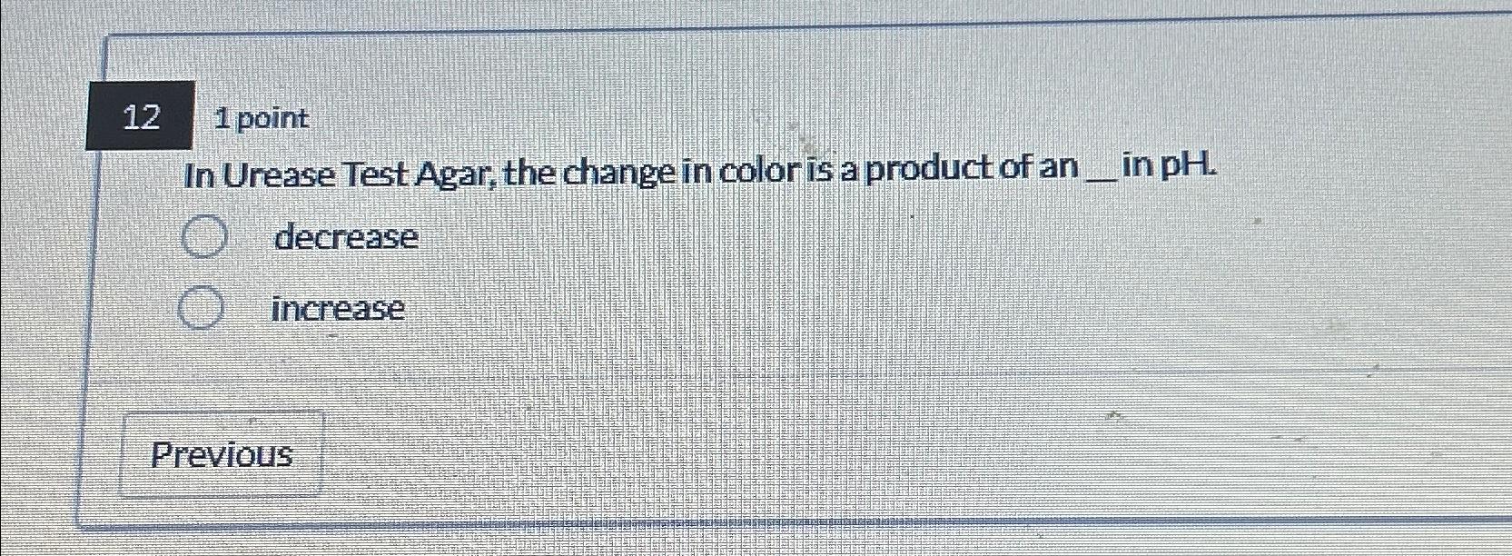 Based on this image's title: “Solved 121 pointIn Urease Test Agar, the change in color is | Chegg.com”