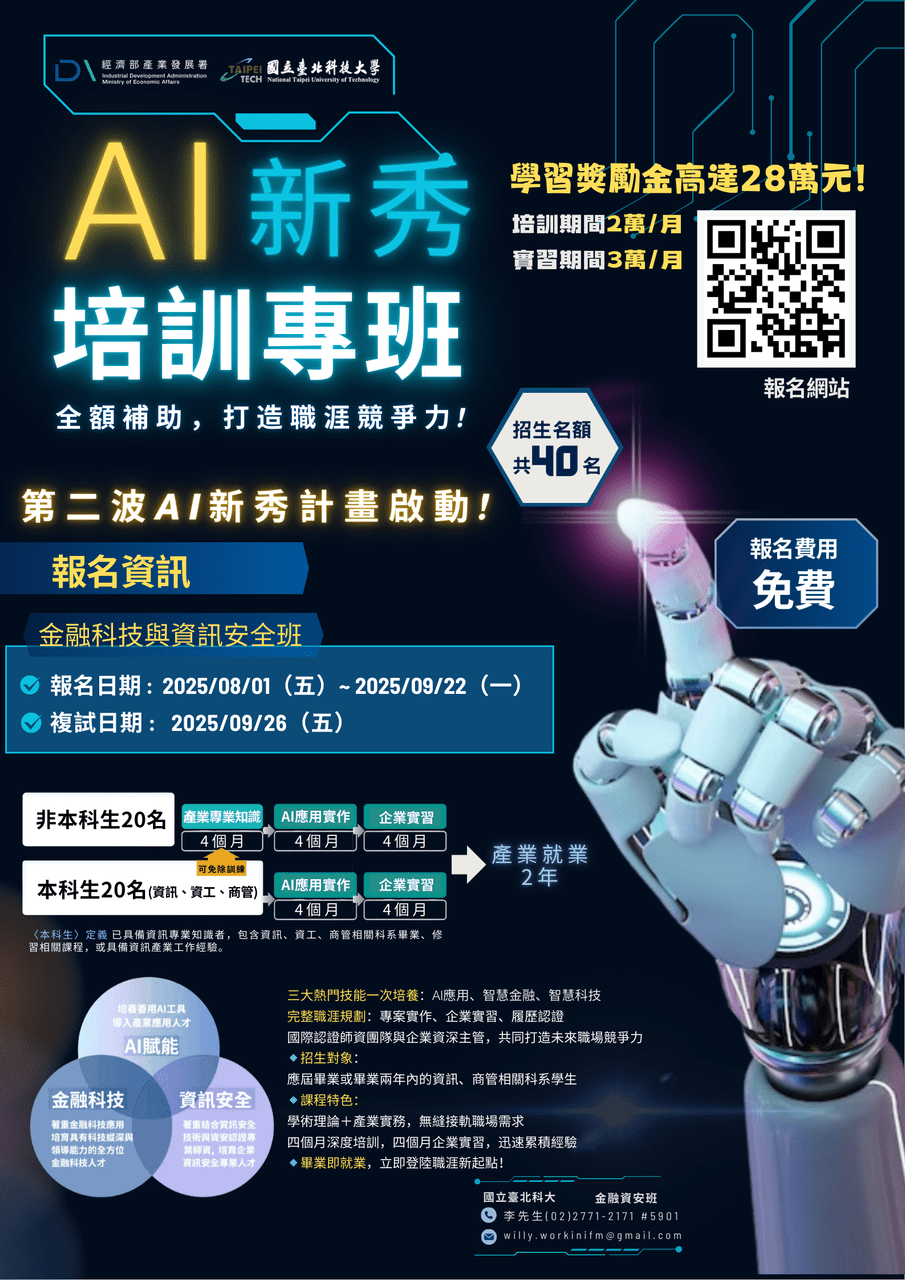 【第二波AI新秀專班 (金融科技與資訊安全班) 開始招生了— 打造你的科技職涯關鍵力!】經濟部產業發展署與臺北科技大學共同攜手助你從新鮮人直通 ...
