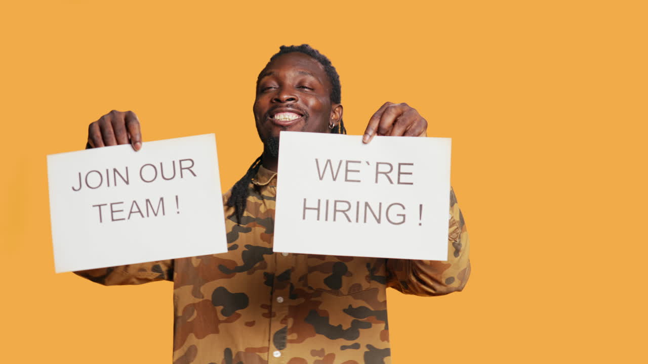 Premium stock video - Smiling recruiter showing hiring messages on papers