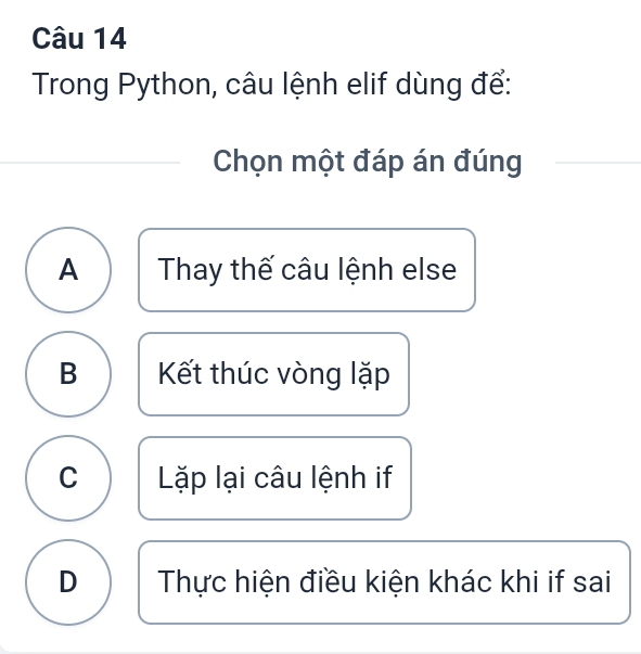 Giải quyết:Trong Python, câu lệnh elif dùng để: Chọn một đáp án đúng A ...