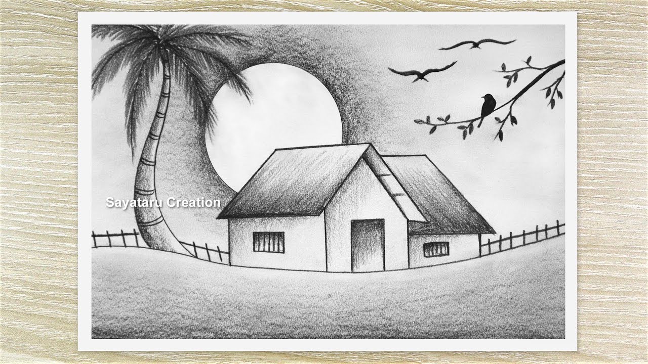 How to draw sunset scenery easy drawing with pencil pencil sketch ...