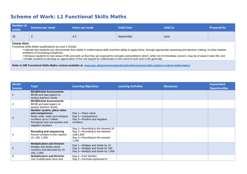 L1 Functional Skills Maths Scheme of Work | Teaching Resources