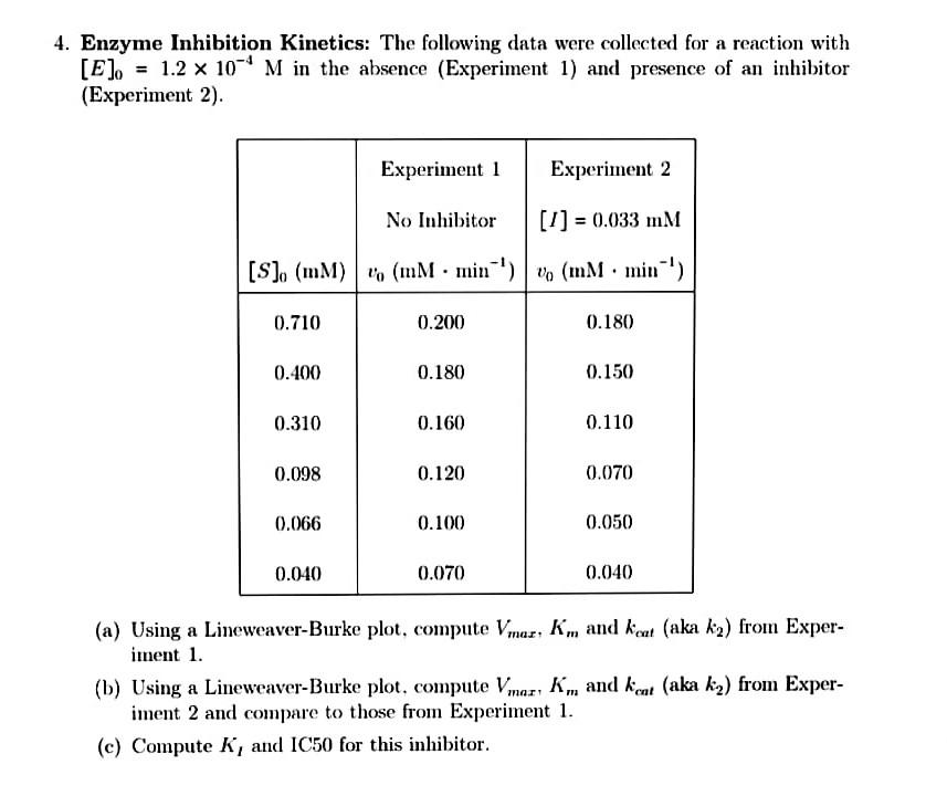 Solved 4. Enzyme Inhibition Kinetics: The following data | Chegg.com