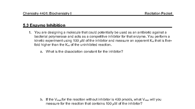 Chemistry 4401: Biochemistry I Week 9 Study Questions on Enzyme ...